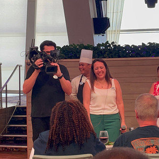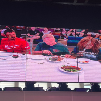 After breakfast, we went to our room for Patrise to get ready for the Master Chef Cooking Competition. The elimination round would start at 11:30 am in one of the large capacity auditoriums. I had urged Patrise to sign up for the competition, because I truly believe that she is an excellent cook and that she would enjoy the experience. Well, today was the day for her team’s competition. There were two teams of 5 amateur chefs, competing against one another, in order to get to the final round tomorrow, Saturday, April 29th. They were to make a steak dinner with all the fixings, for the three-judge panel, in 20 minutes.