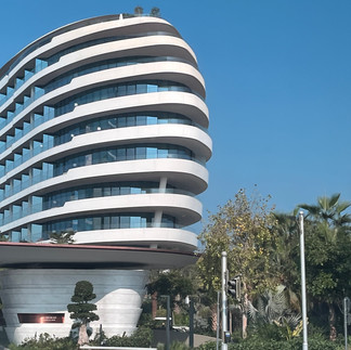 Top Row: Hotel in the shape of a sail, a hotel in the shape of a cruise ship, a picture of the two.
