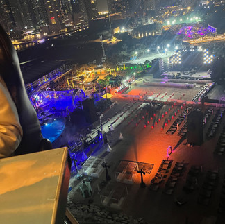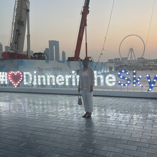 We rested briefly at the hotel, then prepared to go out for the evening. Doug had made a reservation for an attraction called "Dinner in the Sky," prior to our departure from Atlanta. It was much ballyhooed on the internet, when asking about places to see in Dubai. We got to our destination, but it became apparent that this was not what he thought we would experience. What he thought was that this would be a nice dinner at a high floor in the Burj Dubai, surrounded by four walls, having a solid floor, etc. What it proved to be was literally being strapped into a chair (with other guests) around a table, then hoisted by a crane, 50 meters (165 feet) into the air, where a set of chefs served prepared, preordered meals, took photos of you, and moved to loud, mostly hip hop, tunes while you looked at views of the Dubai skyline and the ground. There were two crane-lifted tables with 18 dinner guests each. The food was actually excellent, but the "environment" made it difficult for Patrise and I to truly relax. We placed this in the category of "been there, done that, got the t-shirt": those things we will say that we did, but also be quick to say that we are not likely to do again. Here are several "Dinner in the Sky" photos.