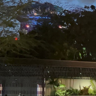 At the hotel we chilled, literally and figuratively for the afternoon, reading a book (Patrise) and watching a movie (Doug), until it was time to go out for the evening. When 7pm arrived, we left the hotel to go to the light show at the Gardens by the Bay. We enjoyed sitting in the park environment and watching the lights (even though we had a limited view, because we were outside the park. Here are some photos of what we saw.